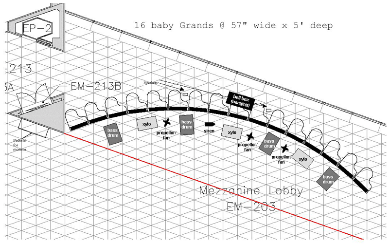 Floor plan for the 16 grand player pianos at the National Gallery of Art. Dada exhibit hall is to the right.