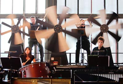 Lukas Hellerman of musikFabrik, the performing ensemble: It went very well! The audiences were enthusiastic (two performances,around 900 people attended each). The propellers and the bell array worked fine, as well as our xylophone configuration and the drums (spread over the whole 22m of the stage, each with different instruments for the 'tone heights' of the score). Only one Disklavier stopped playing in the second performance. Although during the rehearsals one of them playedwhile all the other instruments were quiet and waiting for the downbeat"Play it Again, Sam"... It was great fun for the 15 percussionists! Horst Mohr, player-piano builder: On Saturday, August 17th, there was a wonderful performance of George Antheil's "Ballet Mécanique" in a hall of the old coal mine "Zeche Zollverein", now devoted to world cultural heritage (WeltKulturErbe). It was the climax and finish of a series of more than 60 concerts in 9 weeks: "Klavierfestival Ruhr" (www.klavierfestival.de) the world's greatest piano festival. Art director (künstlerischer Leiter) Franz Xaver Ohnesorg (now Intendant of the Berlin Philharmonics) devoted this festival to America: 18 of the 88 performing artists came from the USA and Leon Fleisher, famous American pianist, conductor and teacher was given an award for his life work. The Ballet was realized in the version Antheil had intended to perform in 1927 in Carnegie Hall. Conductor Dennis Russell Davies stands for precision and authenticity. Four handplayed grands, 16 pianolas, much percussion with bells, siren and 3 propellers - all without any electronic sound. The preparation took nearly a year. Three propeller machines and a set of bells had to be built. About 100,000 notes and accents were transformed into MIDI files, almost all by Dr. Jürgen Hocker, who was in charge of musicological and computer care and control for this concert. (Musikwissenschaftliche Beratung und computertechnische Betreuung). The Yamaha Disklavier uprights were collected from all over the country. 14 Disklaviers were positioned in two rows. Dr. Hocker's two Ampico grands stood in front, with the four hand-played grands beside. The percussion instruments were on a long platform above the pianolas. The controlling computer was situated together with the lighting controls on a desk in the auditorium. Very impressive also was the lighting: one spot for each piano and one for every musician. Colored lights illuminated the different phases of the music: for example, when the uprights were playing alone, all other lights were dimmed and only the long row of the uprights' white hammers shone in the darkness, performing chromatic clusters. The synchronisation was perfect and the huge chords sounded absolutely together - no trace of fast arpeggios. By the end, the light became bright in the hall and also came in from outside, as the whole building was illuminated. The applause and stamping were overwhelming, and even the many VIPs from the worlds of culture, politics and business clapped hands. George Antheil would have been satisfied! (Thanks to the Mechanical Music Digest mmd.foxtail.com for permission to use this material) Dr. Jürgen Hocker, player-piano expert and programmer extraordinaire: Finally all went well with the Ballet Mécanique. The performances were absolutely great and the sound was really perfect!! We had two performances, because the first performance sold out months ago, and so the organizer planned a second performance at 11.00 pm the same day. As you know (I think you are the only person in the world who knows this) the preparations were extremely difficult. There were different files needed for the [Ampico] player pianos and the different types of Disklaviers and Dennis Russell Davies wanted many tempo and dynamic changes during the piece. For example, since he didn't want any amplification, then to hear the live pianists, the player pianos had to play fairly soft, but only when the live pianists were playing. Other times, the player pianos usually played with full power. Davies tried a proper balance between all the instruments, and I think he succeeded. But during the rehearsals there arose a lot of problems: At one point six of the Yamaha pianos stopped playing. What happened? They were all connected on one cable spool, and the spool got so hot a fuse cut off the current. Also, during a pause in the piece one of the Disklaviers begun to play a jazz piece!! Why? Someone forgot to get out the [setup] disc from the piano. And nobody knows how it began to play the disc. [Some stray MIDI command, no doubt!] Another shock: During the rehearsal only eight Disklaviers played to the finish. Why? We had two run-throughs of the whole piece (27 minutes each), and this was too much for the Disklaviers. They got hot and switched off!! But I think you had similar experience. [Yes, in San Francisco we lost two of them